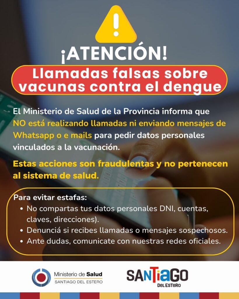 Ante la circulación de llamados y mensajes fraudulentos vinculados a la vacunación contra el dengue, el Ministerio de Salud de la provincia informa que no está realizando ningún tipo de contacto para solicitar datos personales, bancarios o información privada de los ciudadanos.