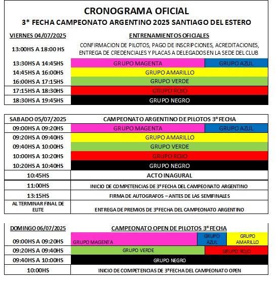 El cronograma oficial incluye entrenamientos oficiales el viernes 4 de julio, con entrada libre. Las competencias se realizarán el sábado 5 y domingo 6, con entradas generales a precios populares. Algunos de los pilotos destacados que participarán son representantes de las provincias de La Rioja, Córdoba, San Juan, Mendoza, Salta, Capital Federal, Provincia de Buenos Aires, Entre Ríos, La Pampa y Santiago del Estero.