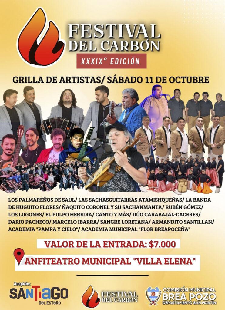 Con una grilla artística que promete emociones fuertes, el Festival del Carbón celebra su edición número 39 reuniendo a grandes referentes de la música popular. Actuarán Los Palmareños de Saúl, Las Sachaguitarras Atamisqueñas, La Banda de Huguito Flores… ¡y muchos más!