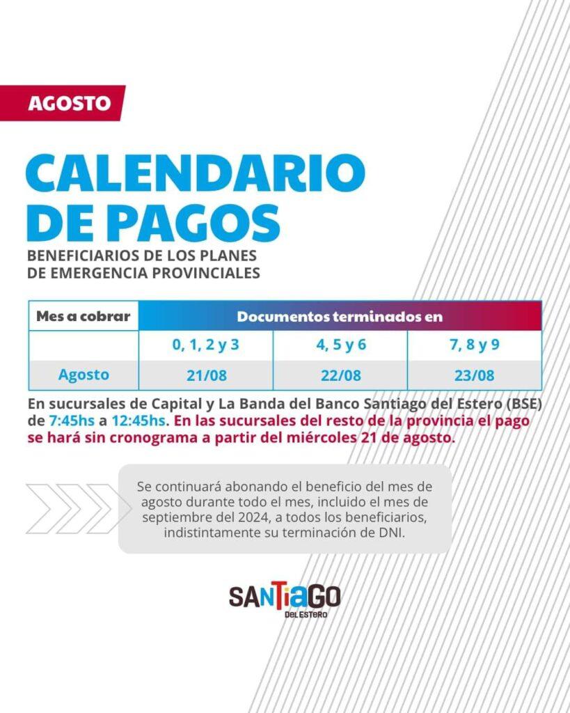 Los pagos serán en las sucursales del Banco Santiago del Estero (BSE), y en Capital y Banda, se harán conforme al siguiente cronograma: