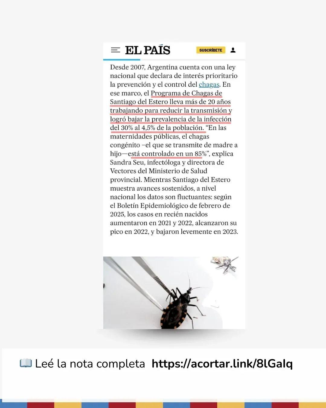 Santiago del Estero volvió a ser noticia en el plano internacional gracias a su política sanitaria sostenida frente al Chagas congénito. La prestigiosa publicación europea El País subrayó el trabajo del gobierno provincial liderado por el Dr. Gerardo Zamora, en la prevención de esta enfermedad, señalando que “Santiago del Estero lleva años trabajando para que ningún bebé nazca con Chagas”, en un artículo difundido en la sección América Futura, especializada en salud, ciencia y derechos humanos.
