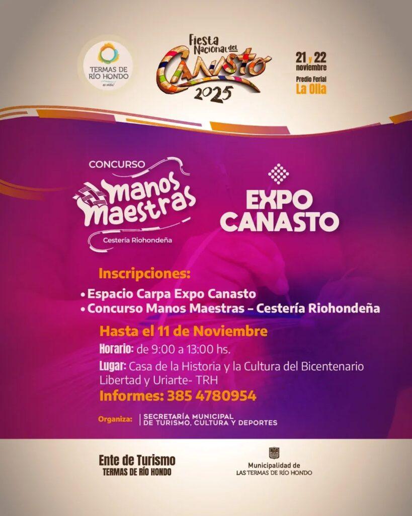 La Fiesta Nacional del Canasto 2025 se llevará a cabo los días 21 y 22 de noviembre en el Predio Ferial “La Olla”, consolidándose como un evento que celebra la identidad, el arte y el oficio que distingue a Las Termas de Río Hondo en todo el país.