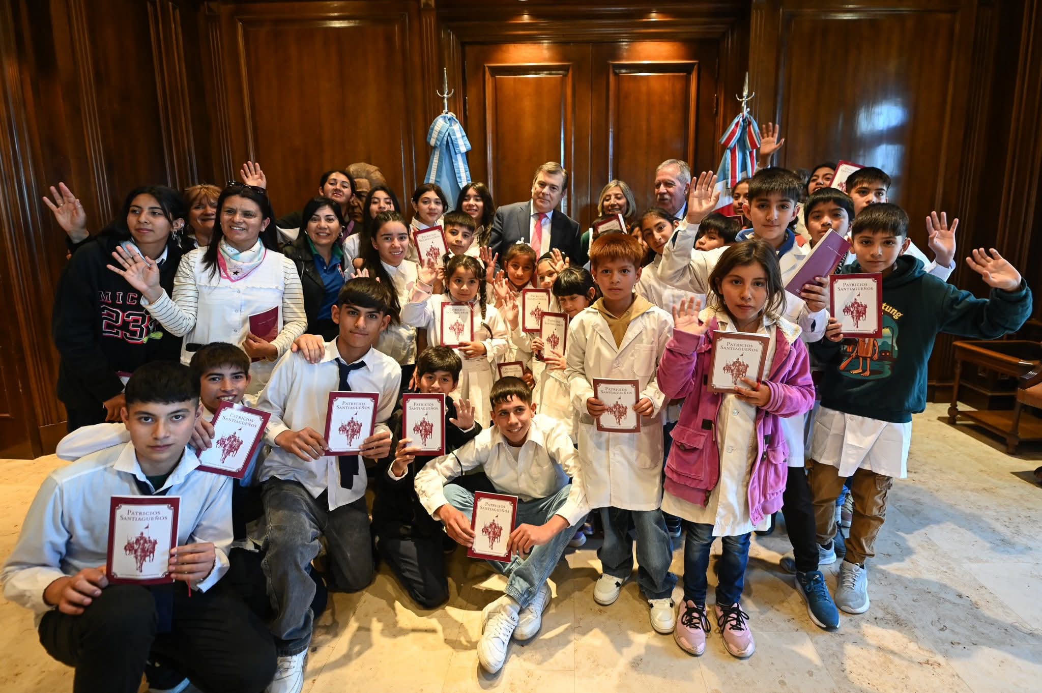 El gobernador Gerardo Zamora, acompañado por el jefe de Gabinete de Ministros, Elías Suárez, recibió este martes por la mañana a 19 alumnos de la Escuela Nº 130 “Pedro Miguel Aráoz” de la localidad de El Desmonte y a 8 estudiantes del Agrupamiento N° 86.051 (II) con sede en el Colegio Secundario de San Antonio, ambos del departamento Choya.