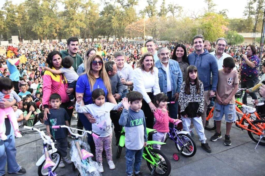 La jefa comunal acompañada por funcionarios del gabinete municipal, hizo entrega de las bicicletas sorteadas con la participación de más 10 mil niños que recibieron sus pulseras numeradas.