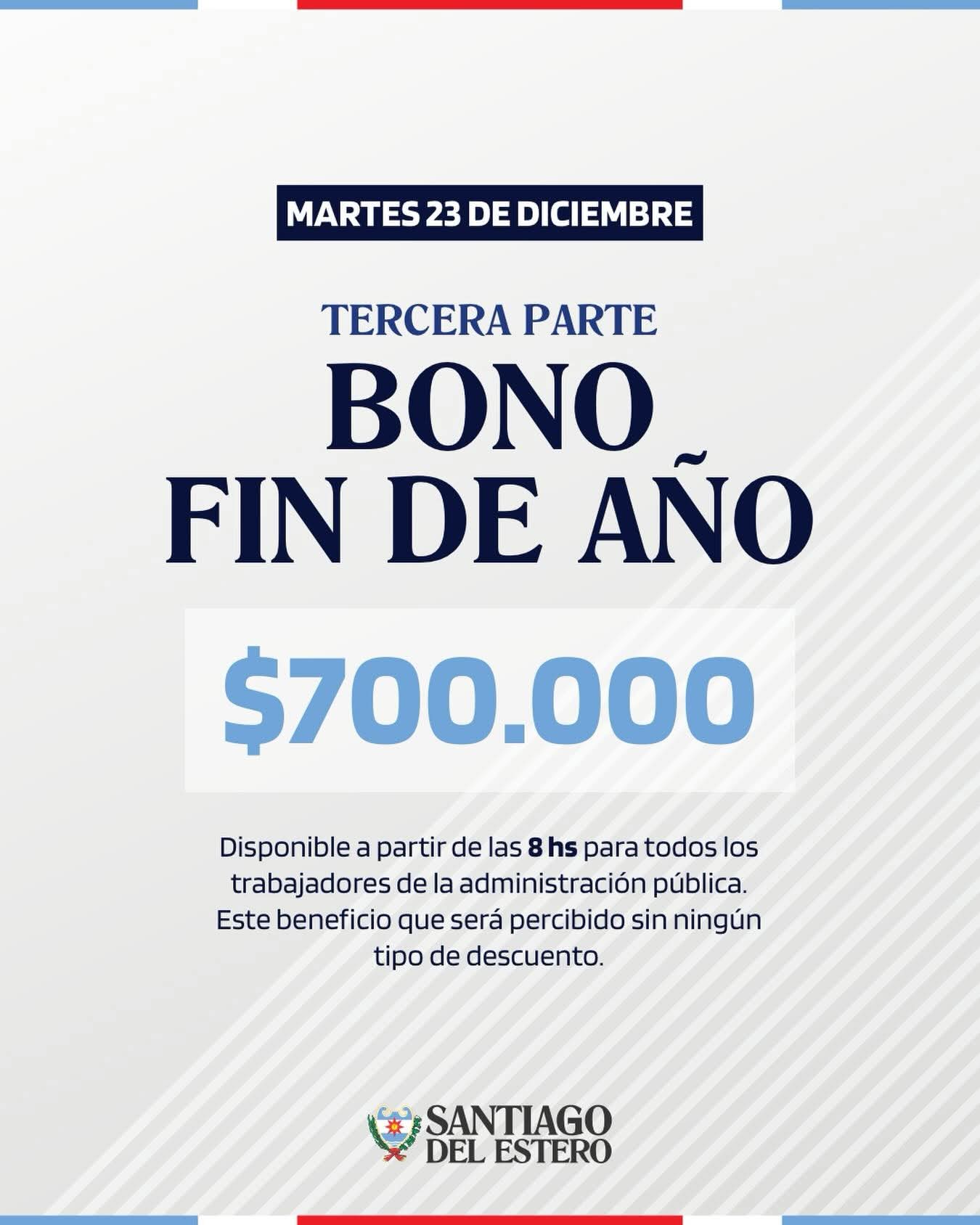 El Ministerio de Economía confirmó que este martes 23 de diciembre, desde las 8 horas, estará disponible la tercera cuota del Bono de Fin de Año, destinado a todos los trabajadores de la administración pública y sin ningún tipo de descuento.